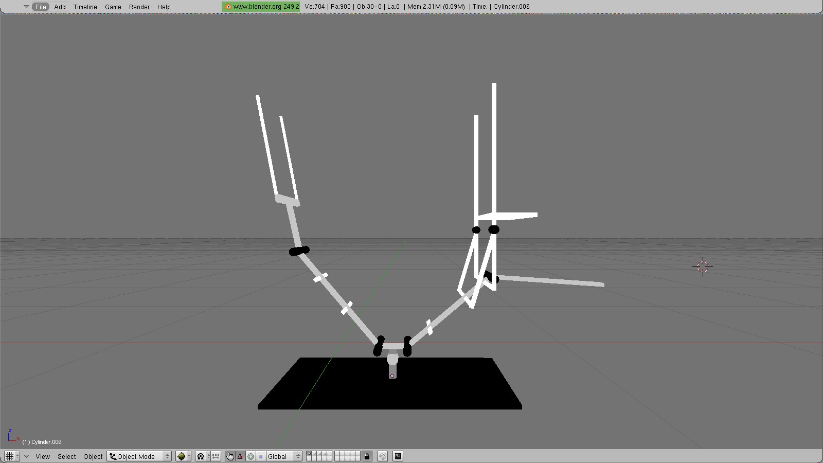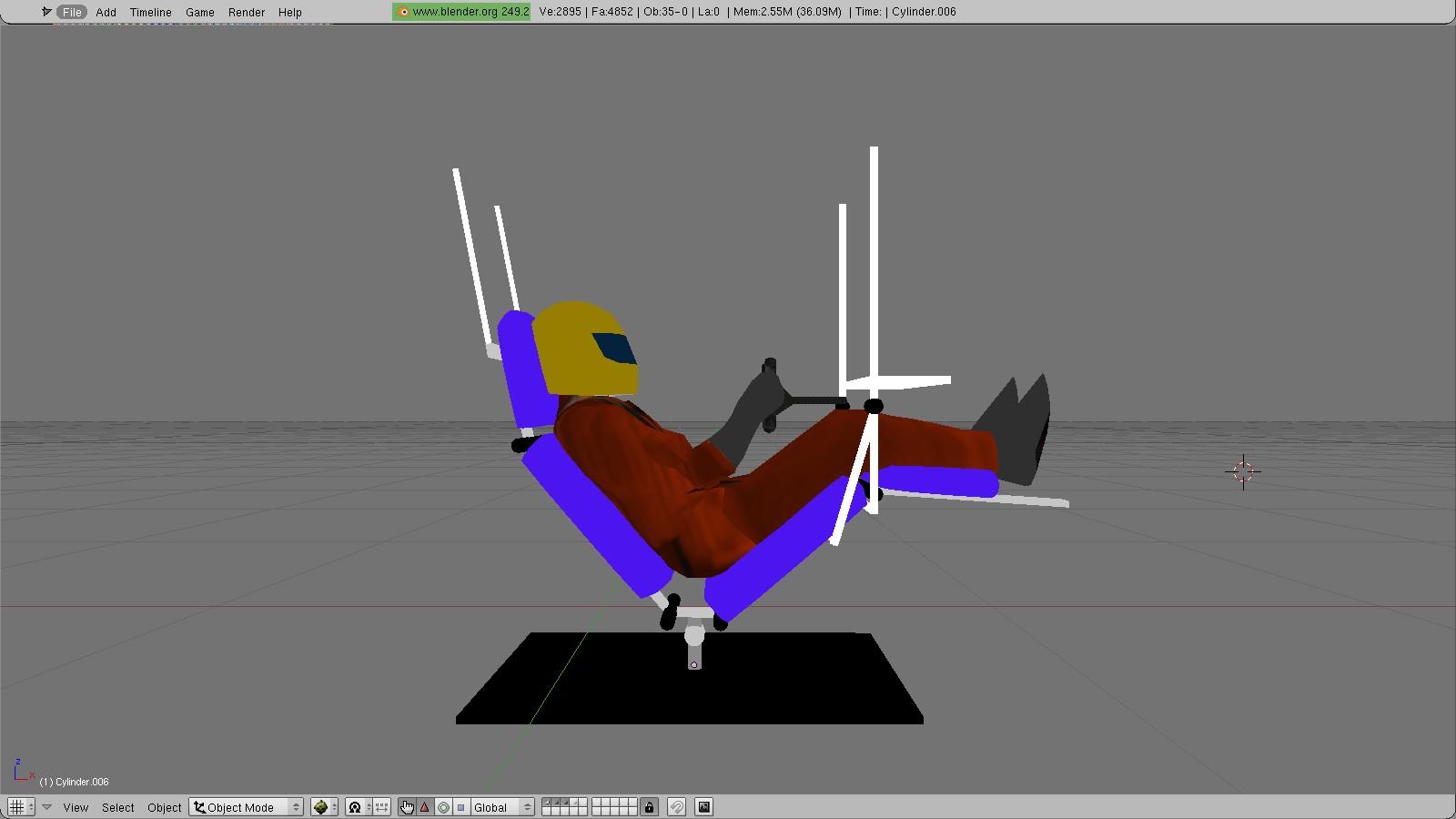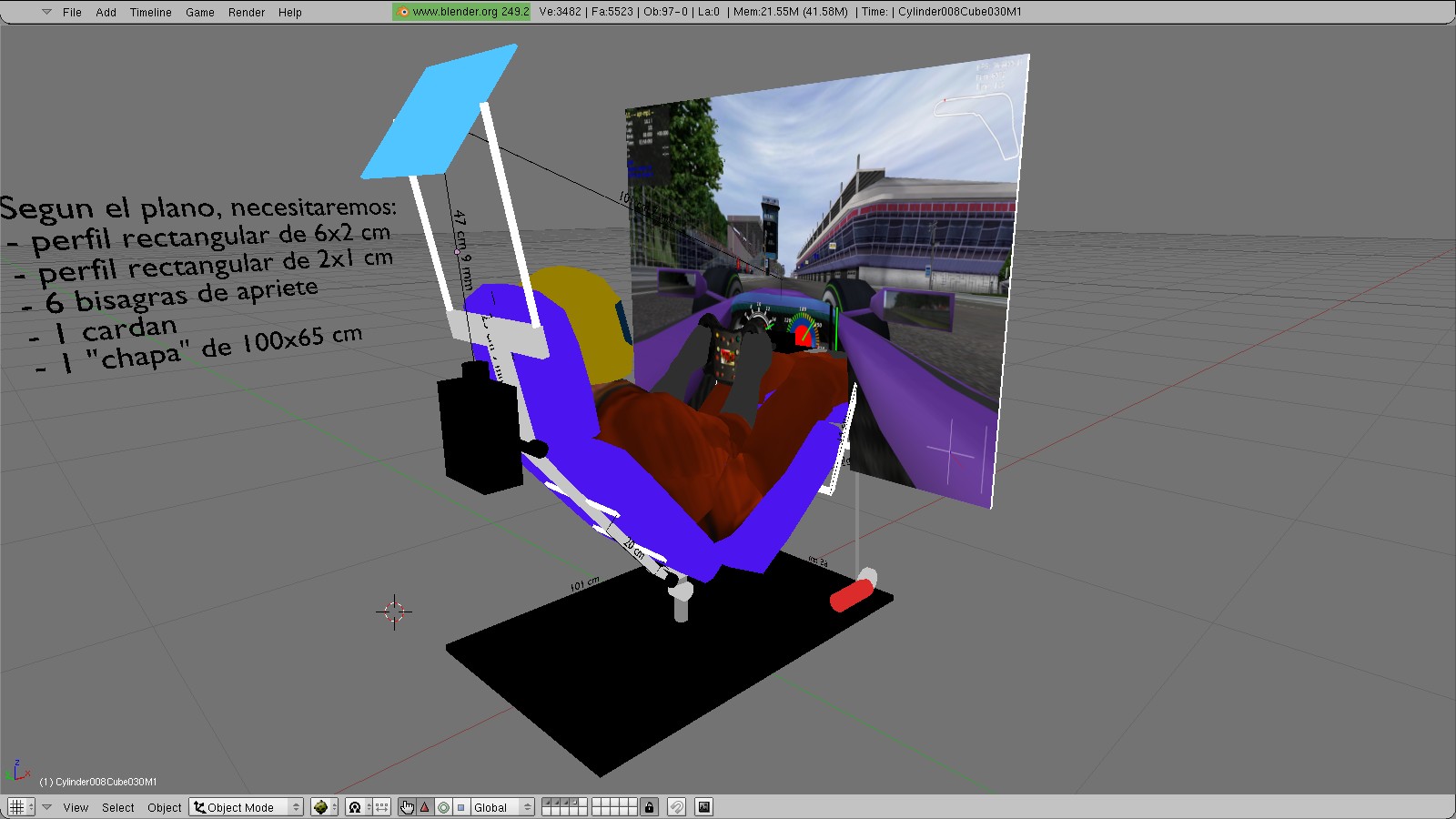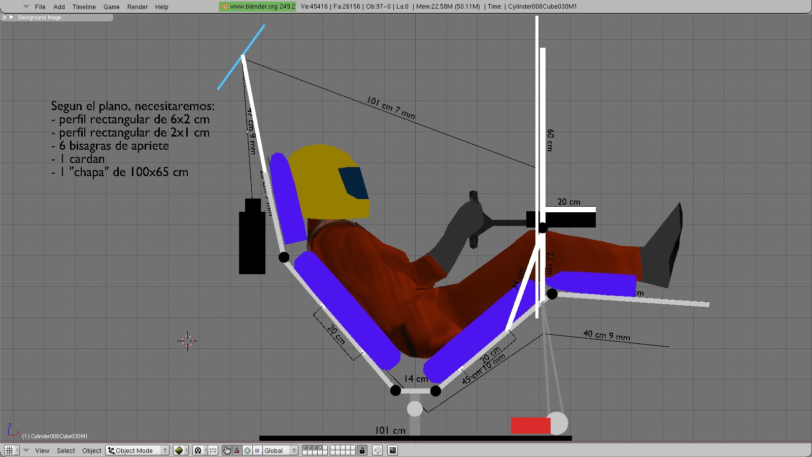 Como la idea ya la tenía en la cabeza, me puse a chatarrear hasta encontrar dos respaldos y dos bases de sillas de oficina, que también escaladas, traslado a su posición en el modelo de Blender.