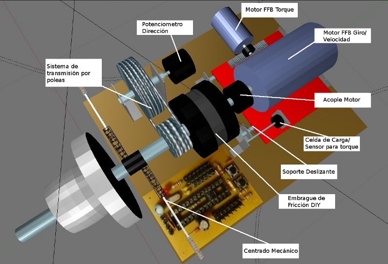 Concretando en esta propuesta, contaría con dos motores. Uno de ellos se conectaría, a través de un embrague de fricción, al eje del volante. De esta forma se transmite velocidad y sentido de giro FFB. El otro motor se encargaría de desplazar, perpendicularmente al eje del volante, un soporte que ofrecería mas o menos presión sobre el embrague de fricción, logrando mayor o menor torque en el eje del volante. El control de la presión se lograría a través de una interfaz electrónica que tomaría los datos de una celda de carga o sensor de presión.